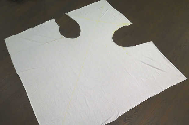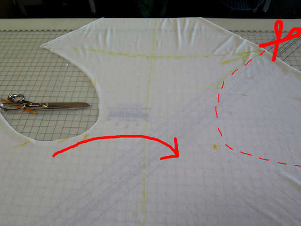 Corte a lo largo de su nueva línea de estilo, ahora si tienes un trozo de tela que se ve un poco como la señal de la bat... Coloque el paño en la forma, fijando a la forma en la parte posterior del cuello y la línea de cintura del centro de la espalda. Párese a otra vez y asegúrese de que está contento con cómo todo se ve. ¿Te gusta su nueva línea de estilo halter?