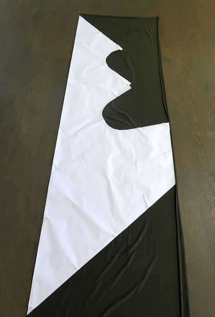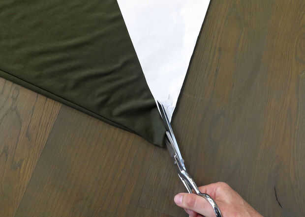Lugar su patrón en la tela con la línea de "corte en el doblez" sesgo del patrón alineado con el borde doblado de la tela. Su patrón probablemente será un poco más grande que su tela en el centro de la espalda opuesta (el pliegue). Ok, solo tienes que recortar algun material extra de la falda del patrón. Sólo Mida y corte un trozo incluso del patrón a lo largo del dobladillo de la falda a partir del punto donde la línea de costura de la falda centro de la espalda con el borde de la tela. Prender con alfileres el patrón a la tela.