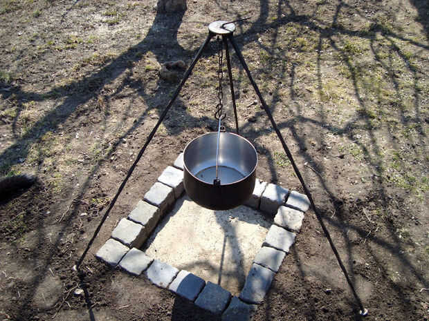 chimenea fácil de materiales disponibles. Un bloque de hormigón y algunos cubos de piedra. Puede ser descompuesto y transferido en otro lugar.