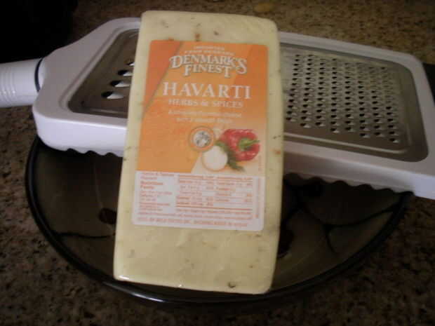 1) rallar el queso. Usé havarti finas hierbas porque eso es lo que tenía en mano. Puede utilizar havarti llano si desea u otro queso de tu gusto.