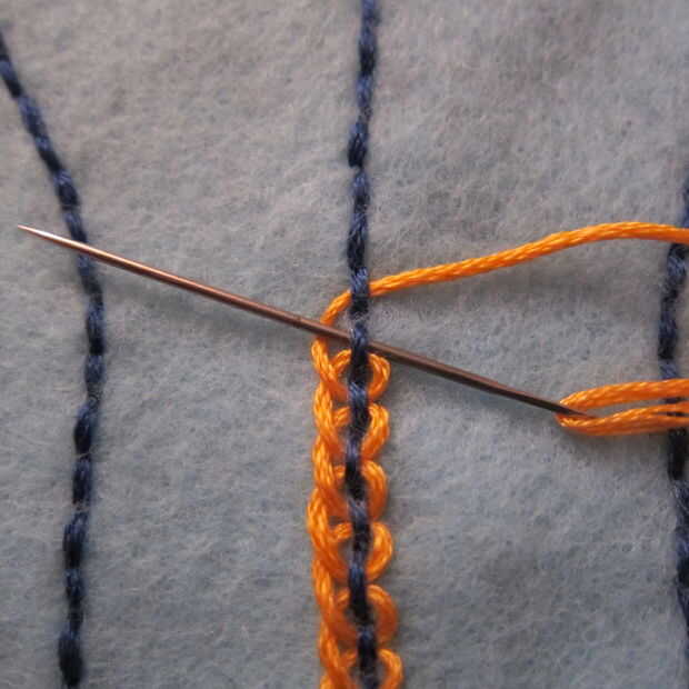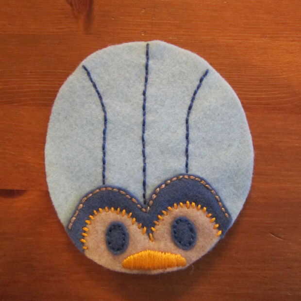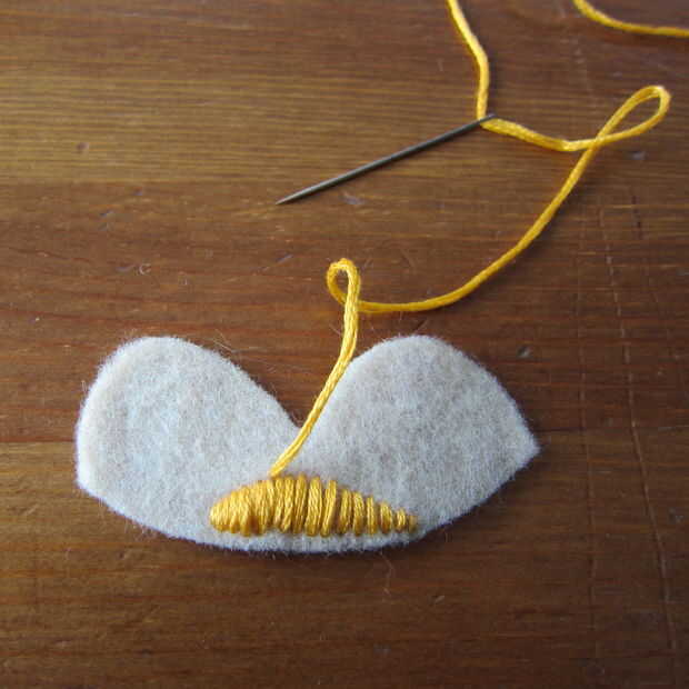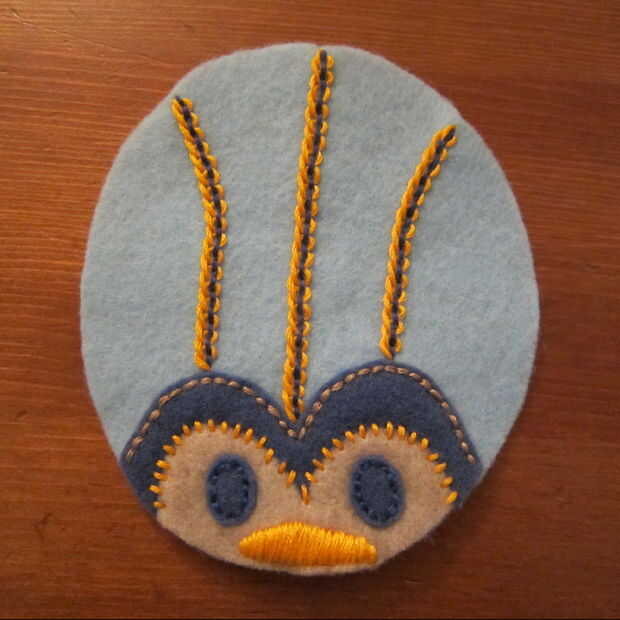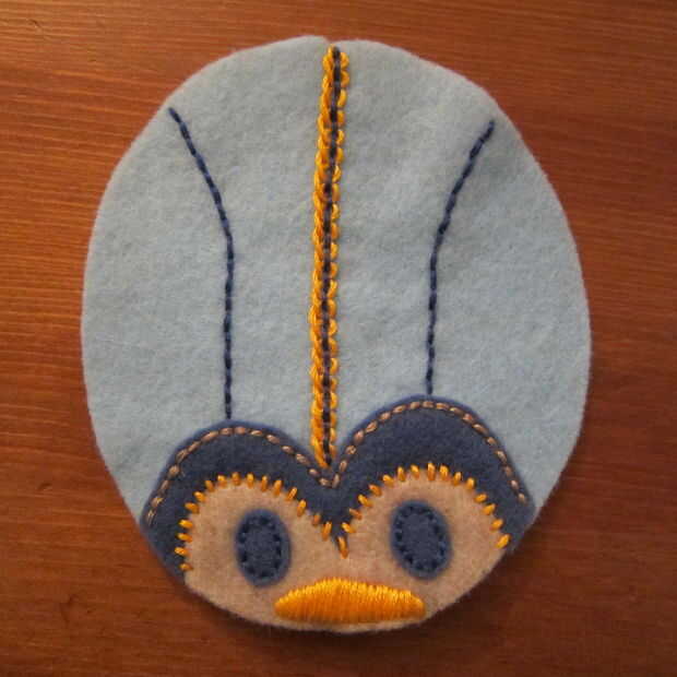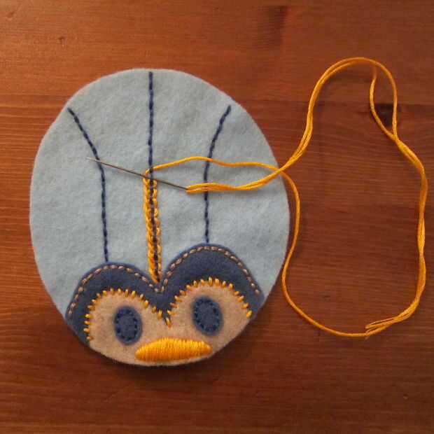 Para las líneas en el cuerpo he utilizado una puntada en dos colores Pequinés. Esta es una puntada muy facil de dominar. En primer lugar hacer una puntada corriente abajo del cuerpo del error usando un color de hilo. Agregar más líneas si quiere más. A continuación, elegir un hilo de diferente color y enrolle el hilo en la segunda pespuntes captura sólo el hilo y no sentía. Recorrer hacia arriba la primera pespuntes tirando al tamaño deseado del lazo. Continuar con los puntos restantes para llenar toda la línea.