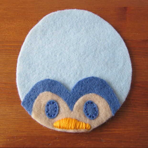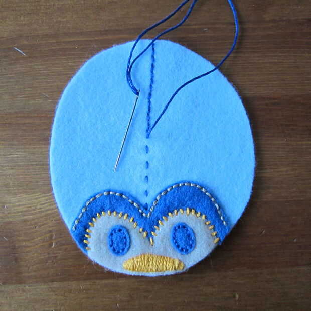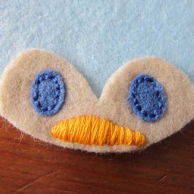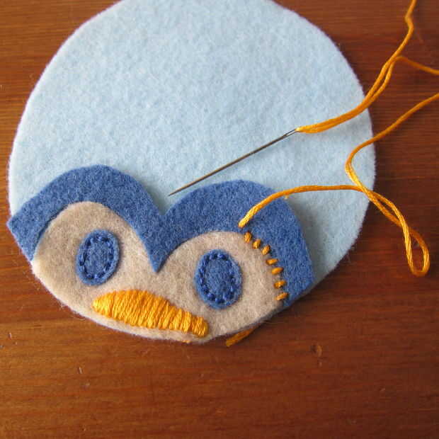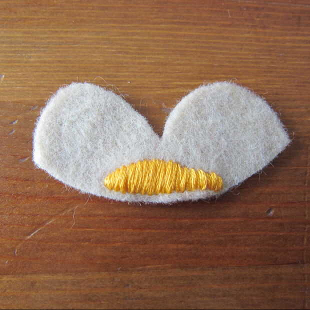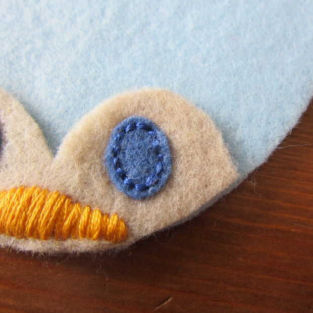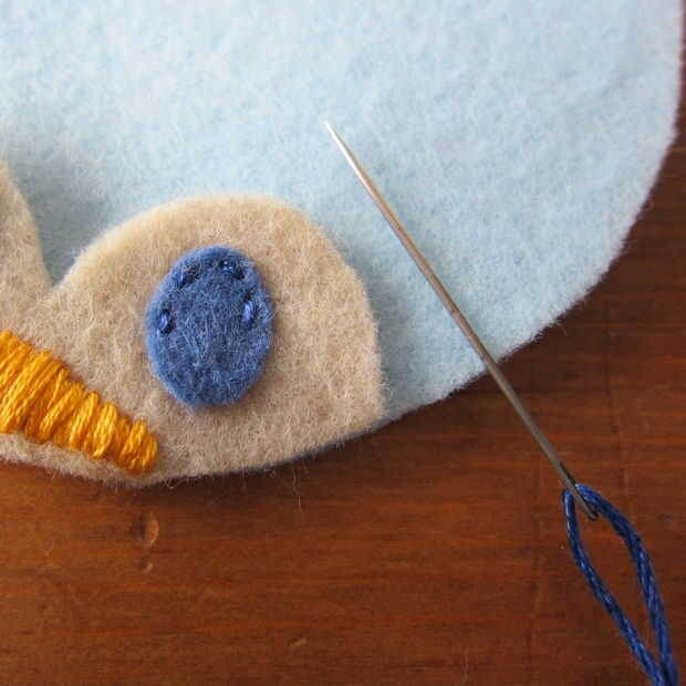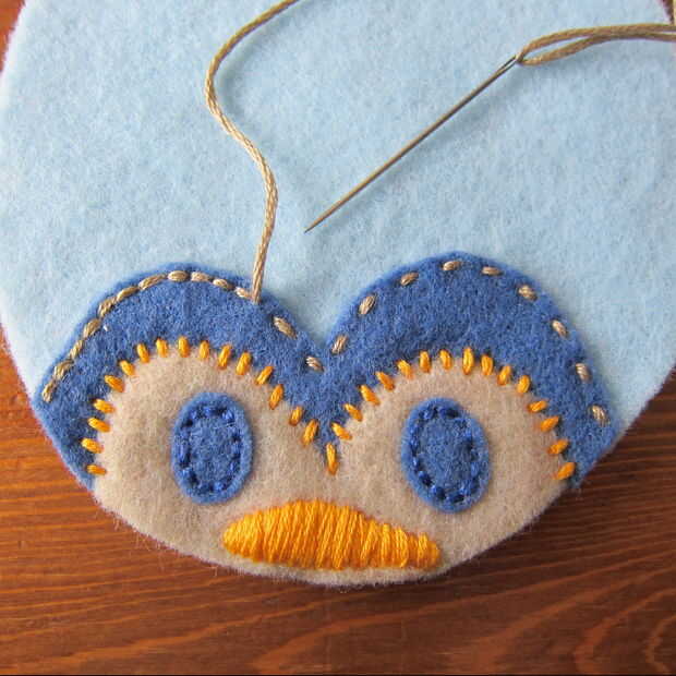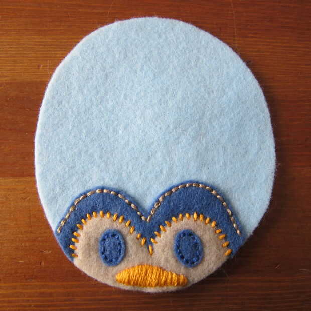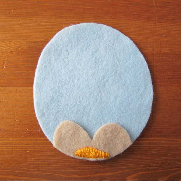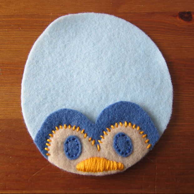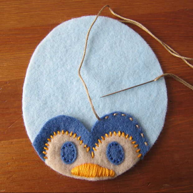 Capa de la pieza de cabeza sobre el cuerpo y puntadas en los ojos. Esto demuestro como puntadas arriba y abajo (a través de lo sentido) porque me resulta difícil de conseguir a través de dos piezas de fieltro utilizando un pespuntes este pequeño. Si usted puede o está haciendo una puntada más larga los pespuntes es mucho más rápido. (Un pespuntes es básicamente un punto de funcionamiento de relleno en los espacios en blanco).
