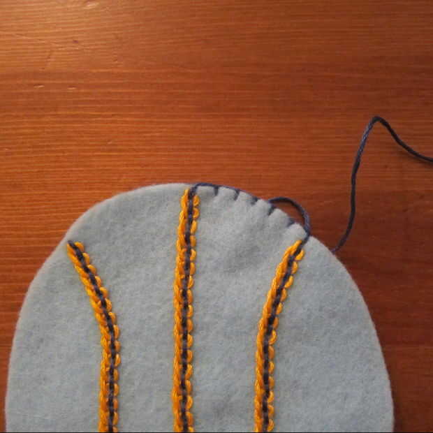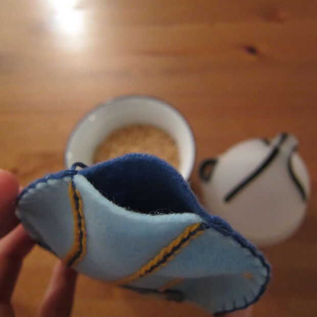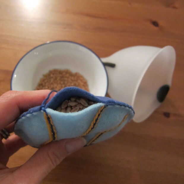 Usando un embudo Vierta en el trigo blando al peso deseado. Continuar con la puntada de carnicero para encerrar el error. Anudar el hilo en la parte posterior y recorte.