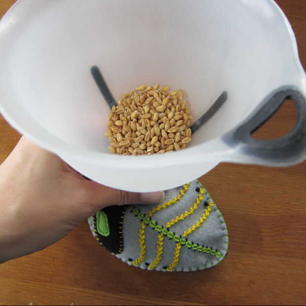 Usando un embudo Vierta en el trigo blando al peso deseado. Continuar con la puntada de carnicero para encerrar el error. La puntada de carnicero es una puntada del azote captura el bucle anterior en cuanto a tener un borde de hilo (imágenes 1-3). Anudar el hilo en la parte posterior y recorte.