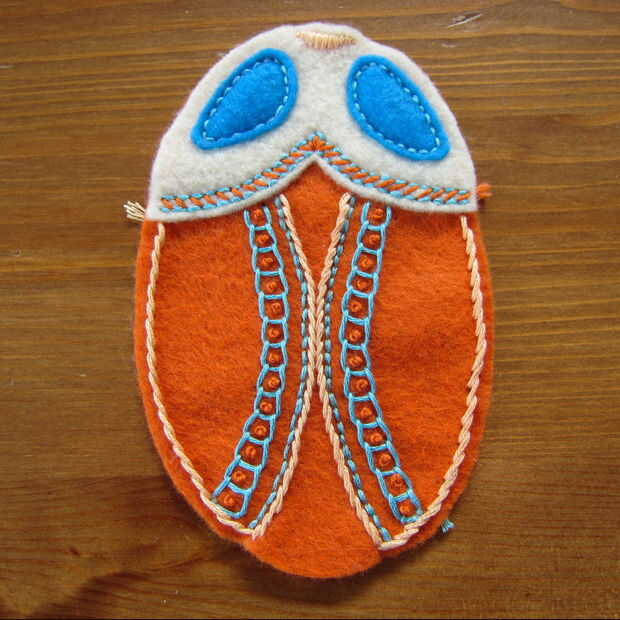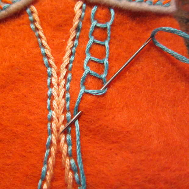 Volver a utilizar los pespuntes para hacer las líneas interiores de las alas. Luego con un color diferente utiliza una puntada del vástago a la línea de atrás dando más detalles (imágenes 6 y 7)