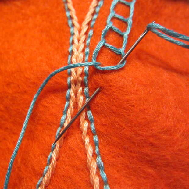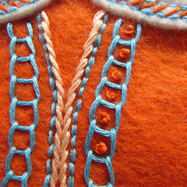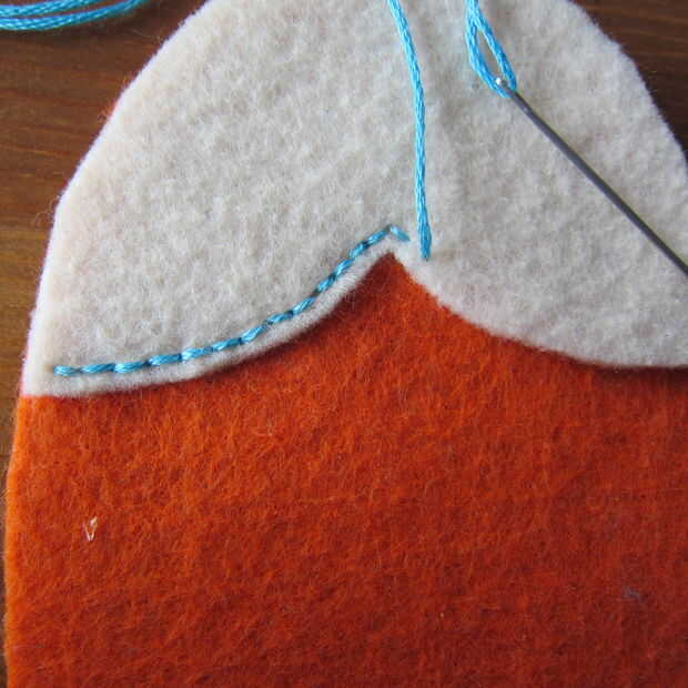 Para las líneas en el cuerpo he utilizado una puntada escalera (imágenes 8 y 9). Esta es una puntada muy facil de dominar. Haces una puntada diagonal no tirar demasiado fuerte como para dejar un pequeño bucle. Luego tomar el lazo con tu puntada diagonal siguiente. Repetir para formar una línea de puntos de escala.