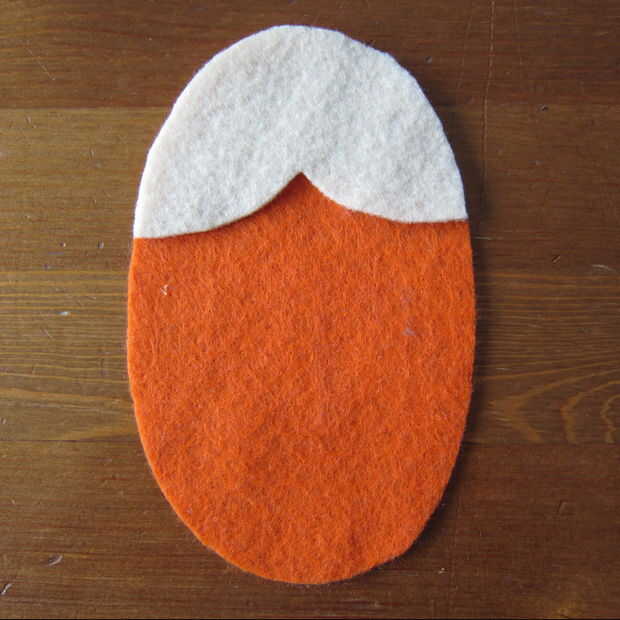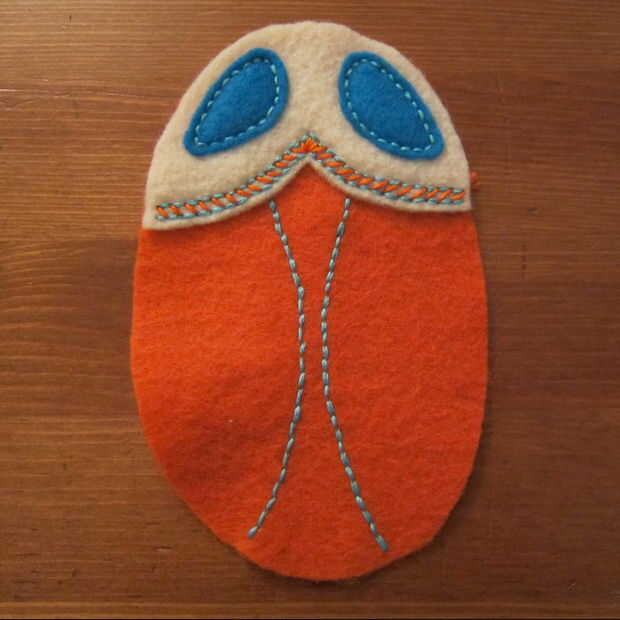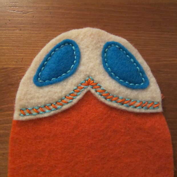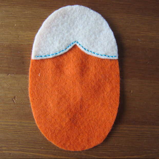 Capa de los pedazos del ojo en la parte superior la pieza de cabeza y puntadas en los ojos. Esto demuestro como puntadas arriba y abajo (a través de lo sentido) porque me resulta difícil de conseguir a través de dos piezas de fieltro utilizando un pespuntes este pequeño. Si usted puede o está haciendo una puntada más larga los pespuntes es mucho más rápido. (Un pespuntes es básicamente un punto de funcionamiento de relleno en los espacios en blanco).