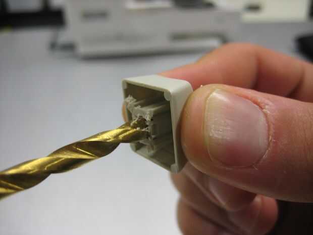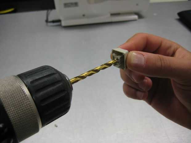 a continuación, perfore un agujero para limpiar el corte que acaba de hacer con la Dremel y claro un lugar donde usted puede pegar en la cabeza de la chincheta. Broca para taladro de las clavijas de empuje tengo requiere un 3/16".