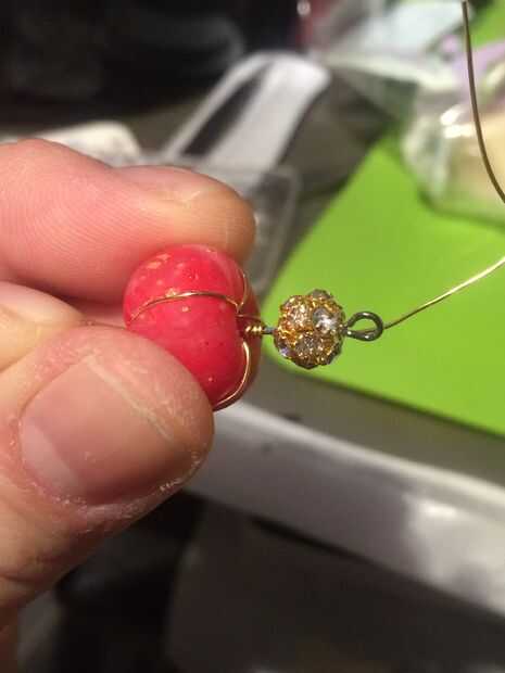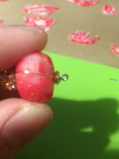 Inserte el perno de la cabeza y el casquillo del grano por el grano. Tomar el alambre de oro y envolver firmemente bajo el lazo de la cabeza. Empuje el perno de cabeza hacia abajo a través de la cuenta y asegúrese de que el casquillo del grano se lava con la parte superior del grano.