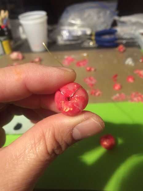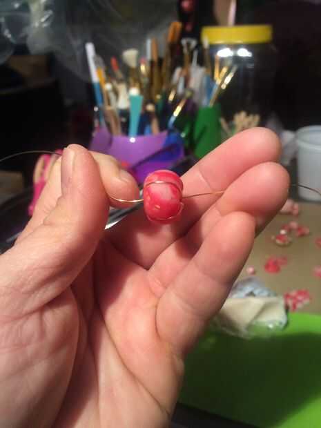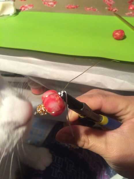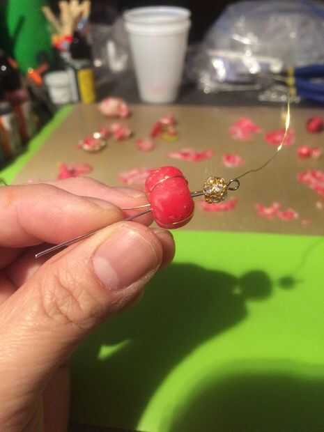 Tomar un alfiler de cabeza e inserte el casquillo del grano a través de él. [Nota: en lugar de utilizar un pre hechos cabeza, también puede hacer su propio por rodar una pequeña pieza cuadrada de arcilla polimérica y adición de diamantes de imitación (véase el cuadro). Hornear la pieza de arcilla con el rhinestone antes de agregar a la cuenta. ]