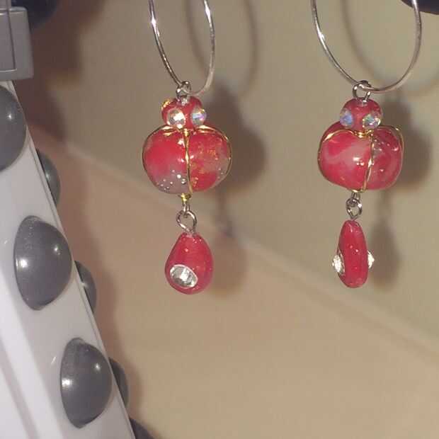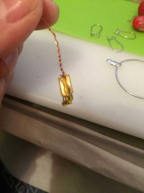 Borla 1 (cuadro 1) - rodillo 2 piezas pequeñas de arcilla en forma de gota de lágrima. Inserte un perno de la cabeza y corte el exceso de cable. Pulse un rhinestone pequeños a ambos lados de la lágrima y cocer la arcilla. Barniz de la arcilla antes de agregar el grano.