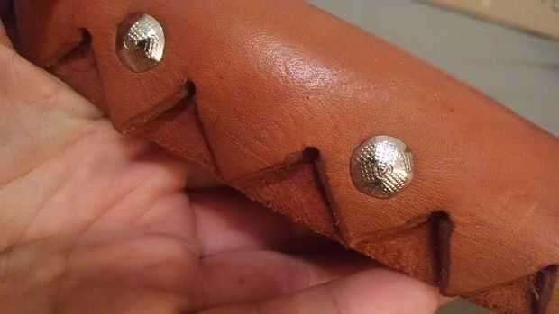 1. Corte el borde de la pieza de cuero para un aspecto acabado. Como se puede ver, hice un borde festonado. Este diseño hace fácil para mí doblar las piezas hacia abajo alrededor de los bordes, eliminando la lucha con pliegues torpes.