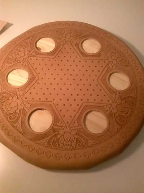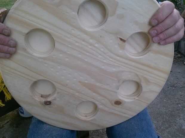 2. con un agujero había visto accesorio en un taladro, perfore los seis círculos trazados sobre la madera redonda. El tamaño del agujero accesorio tiene que coincidir con el círculo cortado de la piel.