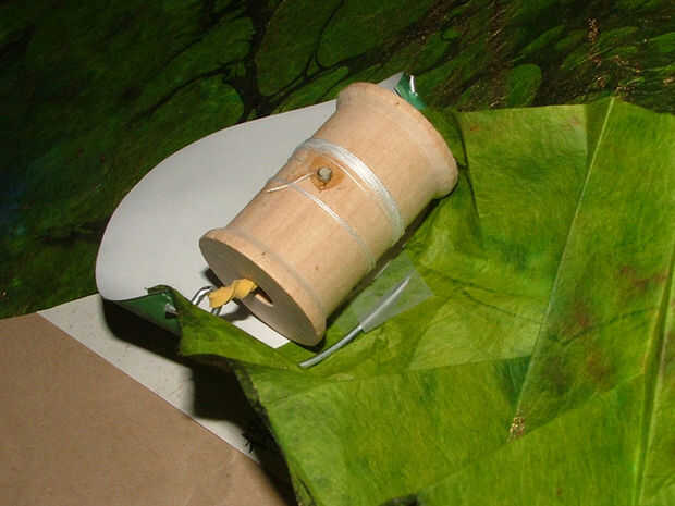 Meter los extremos del alambre por los agujeros en el lado de la máscara el mecanismo de orientación para que si se tiró de la cadena de la bobina movería el dragón hacia atrás.
