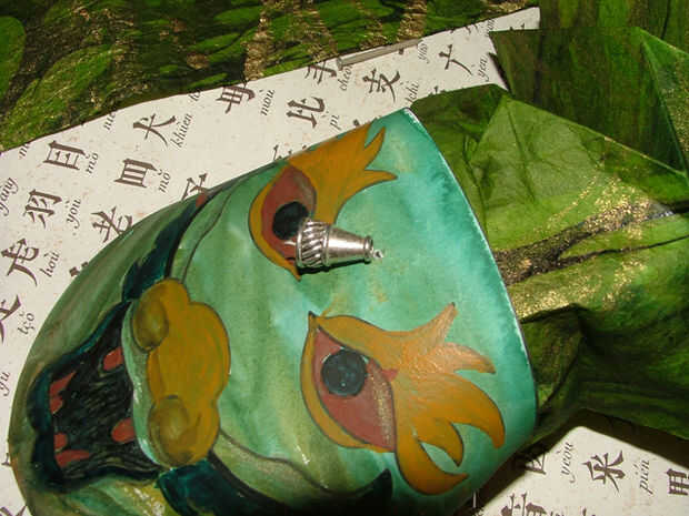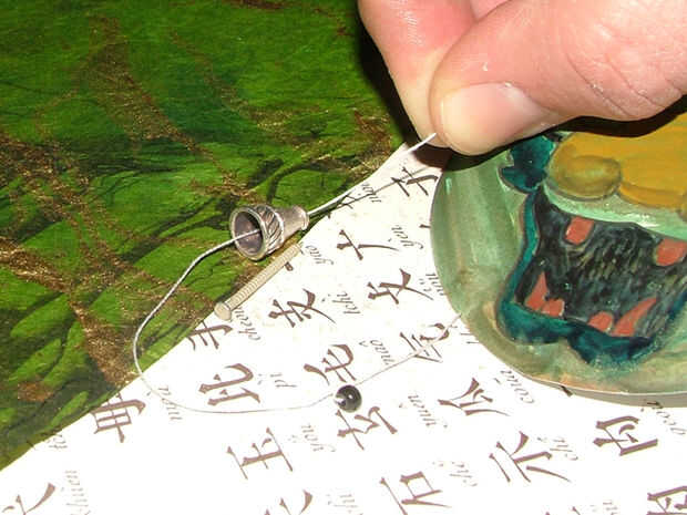 Añadir tire del dedo para mantener el hilo de tracción a través de la máscara. Por supuesto, que puedes hacerlo que quieras: un grano, o asa de plástico o algo. Encontré las piezas para estos tirones de lujo en la tienda de artesanía en la sección de joyería. Tye la rosca a una pequeña cantidad que no a través del agujero en la atracción más grande y asegurar el talón interior con pegamento.