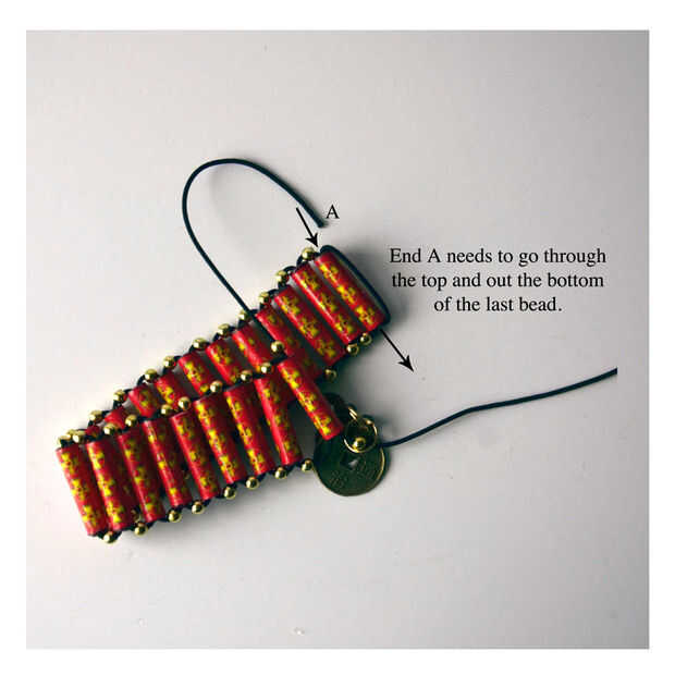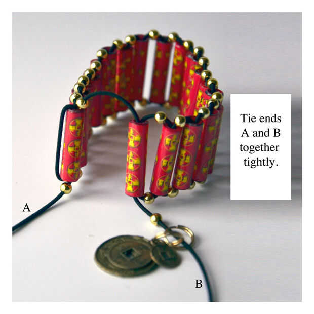 Utilizando el diagrama de arriba, tome el hilo elástico que está saliendo de la parte superior del talón último (A) y empuje en el orificio superior en el primer grano su roscado. Tire de la parte inferior de la primera cuenta. (Ver flechas). Tire de la pulsera en forma y atar muy bien los extremos con un nudo doble tirado muy firmemente contra sí mismo. Luego cortar los hilos del elástico cerca del nudo.