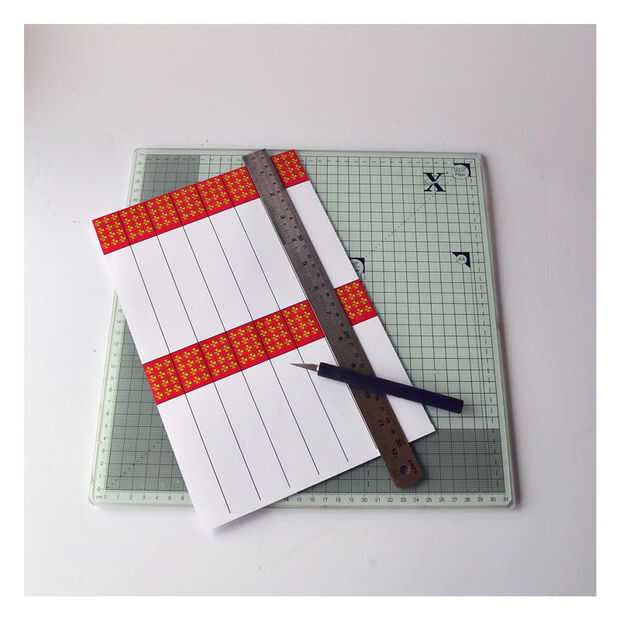 Cuidadosamente utilizando la regla de metal, cuchillo y almohadilla de corte, corte tiras de 14-18 de las plantillas de grano.