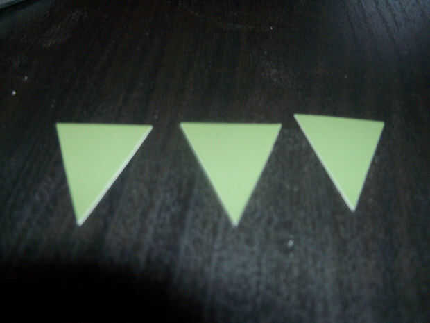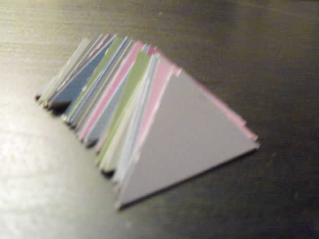 Mi triángulos fueron 1.25" de alto y 1" de ancho. Primero se corta el chip de la pintura a la altura de 1.25". Luego midió el 1" base de cada triángulo y finalmente sacó la forma en la parte posterior. Puedes ver mi proceso en las fotos