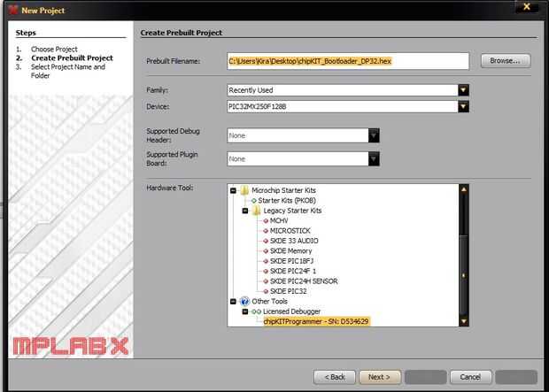 Busque el archivo bootloader e importarlo. Asegúrese de que elegir el dispositivo correcto en el menú desplegable dispositivo y seleccione a su depurador. En mi caso, su PIC32MX250F128B.