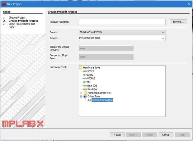 Después de hacer clic en "nuevo proyecto", haga clic en "Microchip incrustado" > "Prebuilt (Hex, imagen cargable) proyecto", entonces estás en el archivo - por ejemplo cargador de arranque para este proyecto.