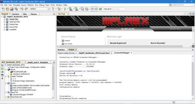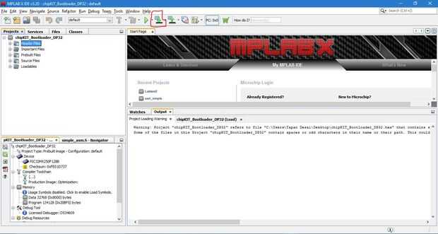 Eso significa botón "marca y programa principal proyecto de dispositivo". Una vez que el gestor de arranque se carga en el chipKit, verá la luz del LED que destella - que significa gestor de arranque se agrega correctamente a su chipKit usando MP laboratorio X.