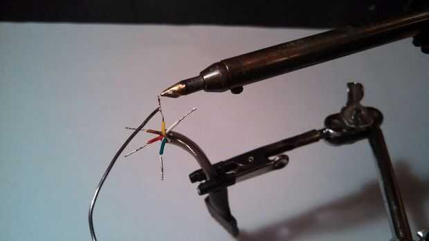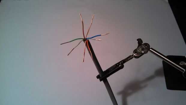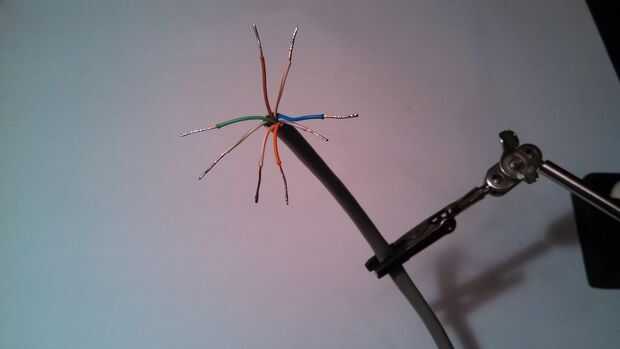 - Corte el cable del remiendo de Cat5e en los extremos donde marcaste anteriormente y limpiar los extremos por desmontaje, torcer y estañar los cables.