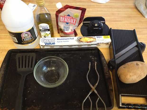 -Patata de - algunos tipo de cocina aceite - condimentación (sal, con sabor a sal, vinagre, etc.)-papel o pergamino papel - cuchillo o algo cortar papas con - pinzas - bol - pan con labio - espátula-envase que chips (sin ilustración)