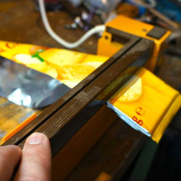 Mi sellador tiene un cuchillo construir cortar el exceso de material. Si el tuyo no, usas tus tijeras.