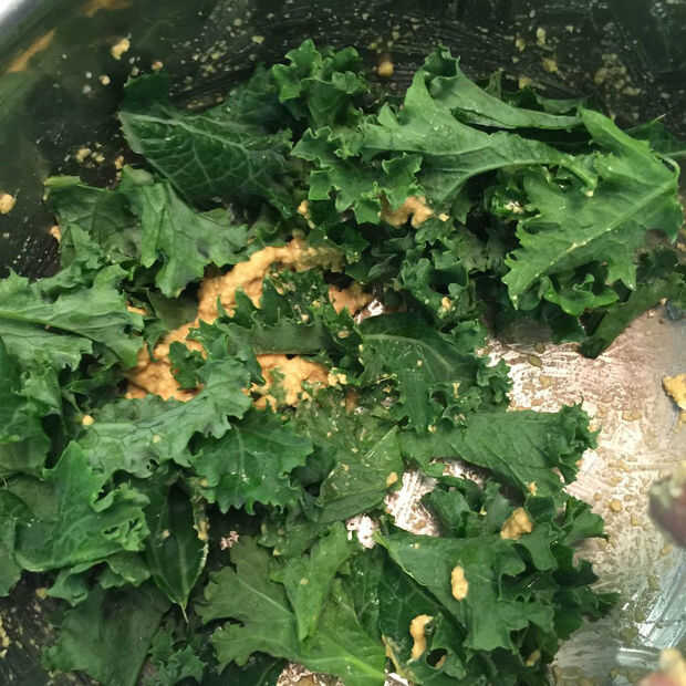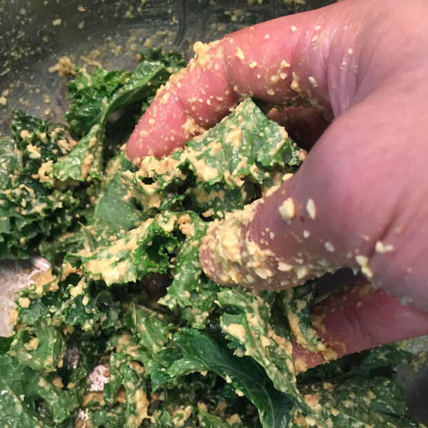 - Añadir un puñado de col en una ensaladera. Poner una cucharada grande de mezcla sobre la col rizada y mezcla a mano. Aunque es desordenado, esto es la mejor manera de trabajar la salsa en todas las superficies de la col rizada. Utilice los pulgares y mueva la mezcla en cada hoja.