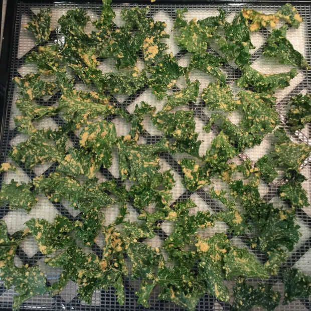 - Coloque sobre alfombras de deshidratador y deshidratar en bajo, 125 grados Fahrenheit por 10-12 horas. Chips se hacen cuando kale y mezcla son secas y crujientes.