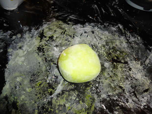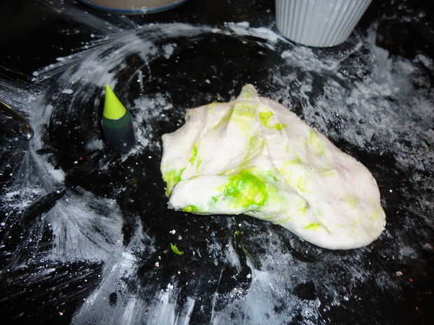 Probar la masa cruda. Si es suave, añadir más condimentos, después de la fritura, las virutas de camarón tendrá sabor menos saladas. Poner la masa sobre una superficie limpia y amasar con las manos hasta obtener una masa muy suave, unos 10 minutos (en este momento agregar gotas de colorante de alimento verde como amase). Cuando se presiona la masa con los dedos debe sentir como presionar su brazo, suave pero firme. Si la masa es dura, Mójese las manos y amasar otra vez. Si su masa es demasiado duro/seco, las galletas se agrietarán durante el secado y lo saben muy secas después de la fritura.