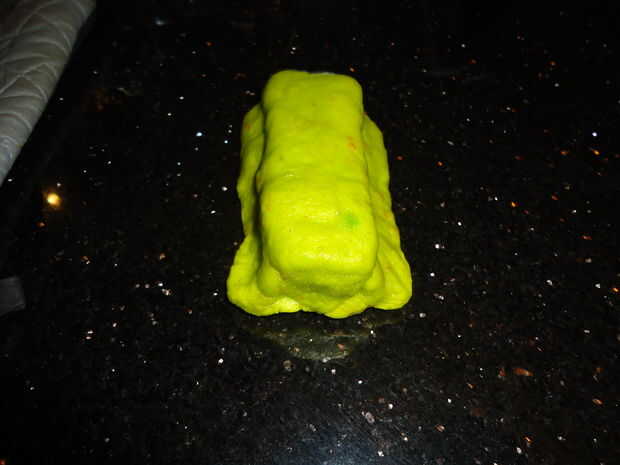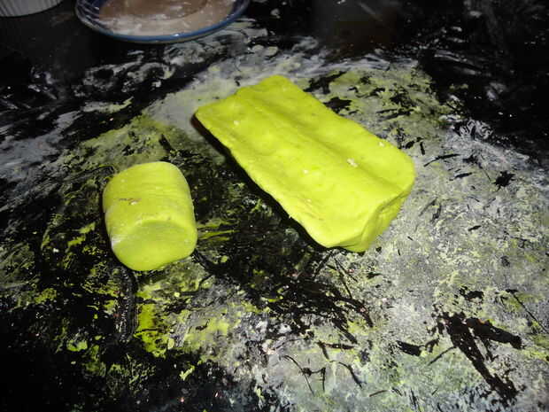 Forma la masa en dos rollos (mitad el espesor de la otra, presione y slap en ambos extremos para compactar los rodillos para remover burbujas de aire. Cortar el panecillo por la mitad y mojar el tamaño corte y fije como "orejas" en el rollo más grande. pellizcar las orejas en forma de "Yoda". Cuando introduzca el rollo de su extremo debe parecerse Yodas cara.