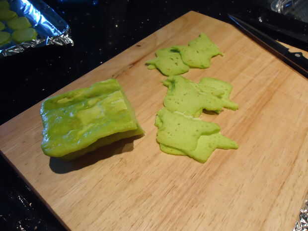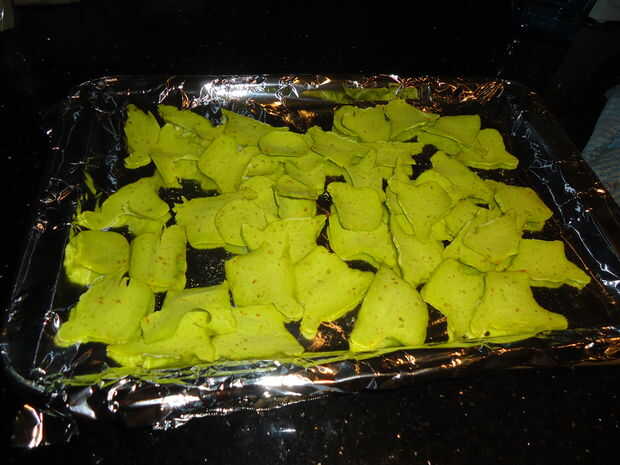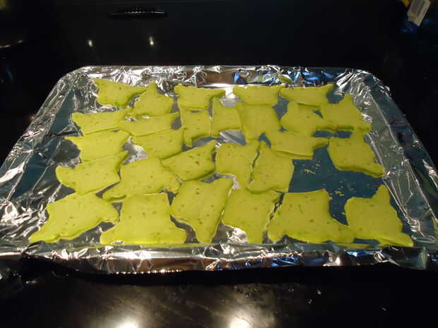 Cuando se cortaron los Yodas puse la bandeja en mi horno de convección en el más bajo posible de temperatura dejando abierta la puerta de un cuarto de la manera. Esto secará las galletas poco a poco sobre todo con el ventilador del horno convección soplando el aire sobre ellos.