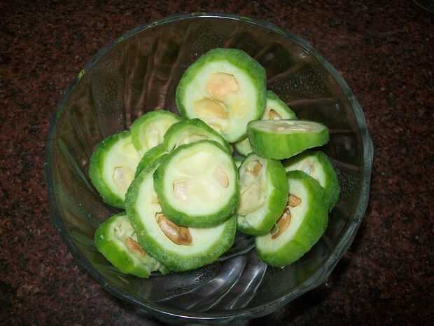 Paso 1: Cortar la Karela (melón amargo) en piezas de la pequeña Luna circular completo. Tratar de mantener el grosor uniforme para freír correctamente. No deben ser demasiado fina ni demasiado gruesa.
