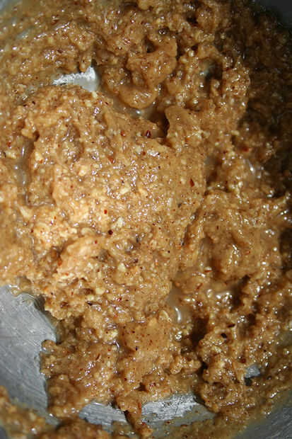 Ahora, hacer una pausa en su mezcla y añadir la leche, un toque a la vez, hasta niiiiice y cremosa y lo más suave que puede considerar la textura de la mantequilla de almendras. Se debe ser espesa, pero tienen una consistencia donde siente puede canalizarlo. Yo digo 1-2 cucharadas de mantequilla de almendras, porque puede que no necesite todo. Oh y revuelva en ese sal. Hace lo bocados extra-royale sabroso.