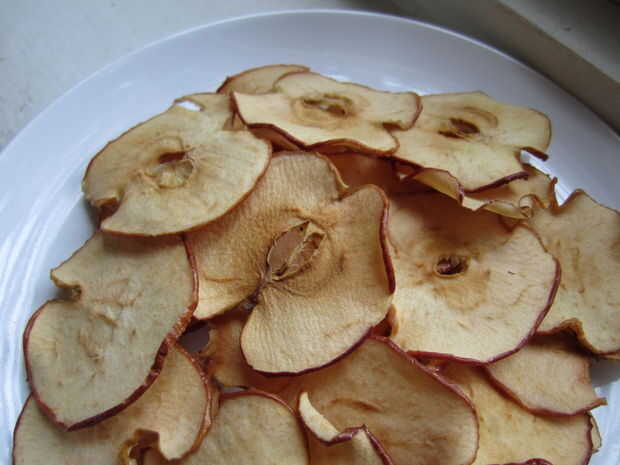 Estos chips son finos en rodajas, empapado en un almíbar y al horno bajo y lento.
