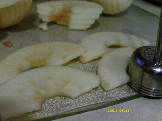 Algunas de sus piezas más grandes pueden tener bits de la base de apple todavía incrustado (también un peligro de asfixia). Puede utilizar su cuchillo de cocina para cortar hacia fuera o puede utilizar un cortador de galletas circulares para corte. Estoy usando parte de un infusor de té porque es simplemente el tamaño perfecto.