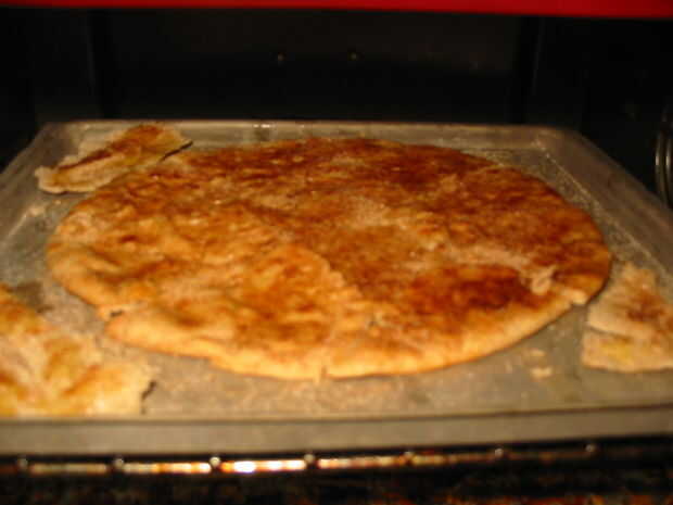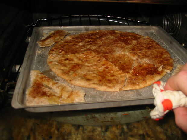 El corte, pitas untadas de mantequilla y canela azucarada en una hornada de la hoja y ponerlos en el horno durante 6-8 minutos o hasta que estén crujientes y no quemado, a menos que usted como quema cosas. Cuando esté hecho, sacar con algo para evitar que se te quema y utilice un tenedor o una espátula para eliminar de la hoja y ponerlos en la bandeja de enfriamiento.