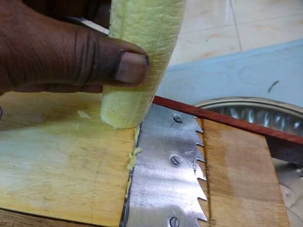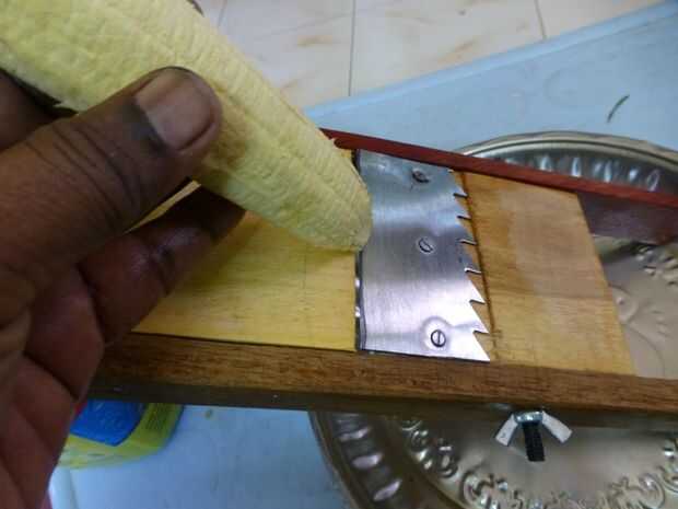 Ajustar la cuchilla de la máquina de cortar de mano por lo que se obtendrá aproximadamente un mm rodajas gruesas. Puede hacer cortes longitudinales manteniendo el plátano pelado en un ángulo o usted puede guardarlo recta que te dará alrededor de rebanadas. Normalmente, Nendran chips se hacen a una forma redonda, así que en rodajas los plátanos manteniéndolo rectos.