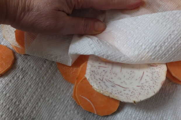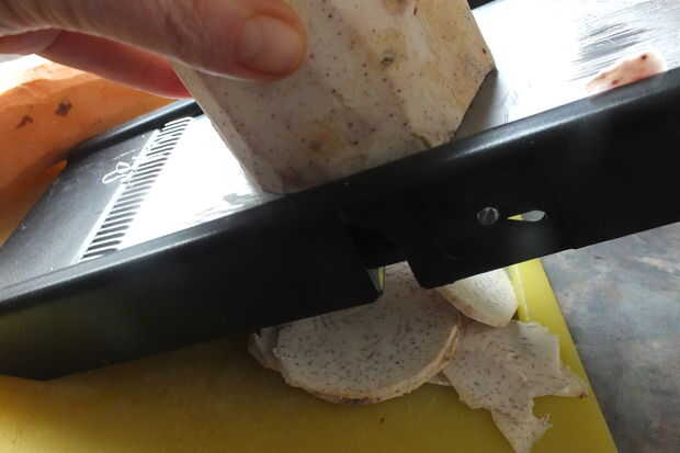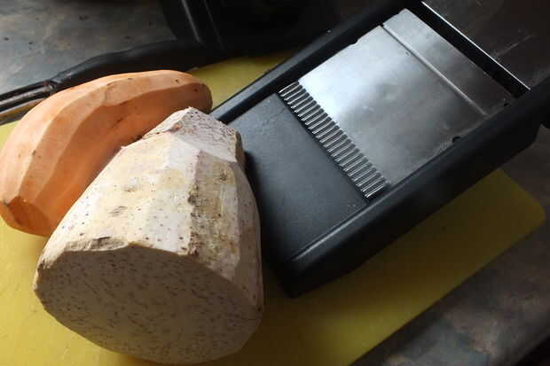 1 batata grande JaponAceite vegetal para freírCondimentosCortar la patata dulce usando un pelador para conseguir la rebanada fina. La batata es un poco difícil, y usando un pelador es más fácil comparar con rallador.Paso 1: Fríe y disfrutar de la mer