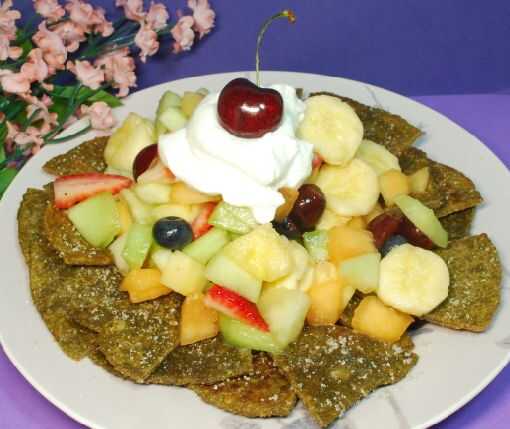Éstos ligeramente endulzado nacho chips son con sabor a almendra y té verde. La salsa de fruta contiene limón y jengibre y todo se remata con picante yogur griego.
