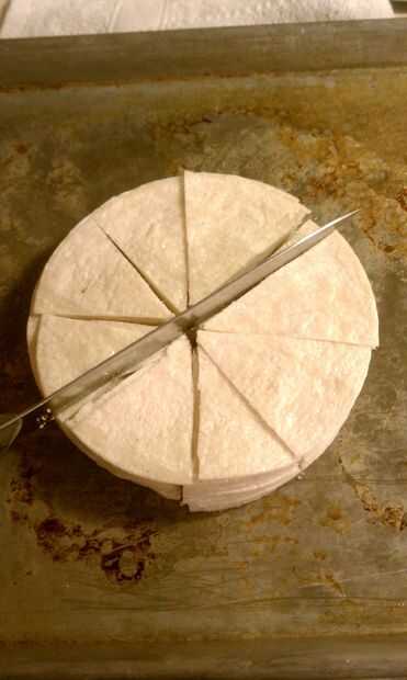Una vez que sus tortillas son todas apiladas, cortarlas en cuartos - si desea que sus fichas a ser más pequeños que este, usted puede cortarlas en octavos.