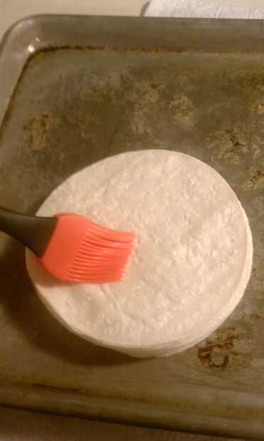 Luego, cepille en un poco de aceite a un lado de cada tortilla y apilarlos uno encima del otro, lado aceitado hacia arriba.
