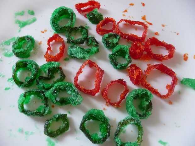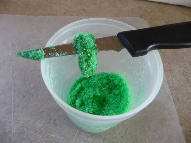 En tazones aparte, combine 1/4 taza de azúcar con unas gotas de alimento verde para colorear y 1/4 taza de azúcar con unas gotas de colorante rojo. Revuélvalos hasta que estés feliz con el color de cada azúcar. Ponga a un lado.