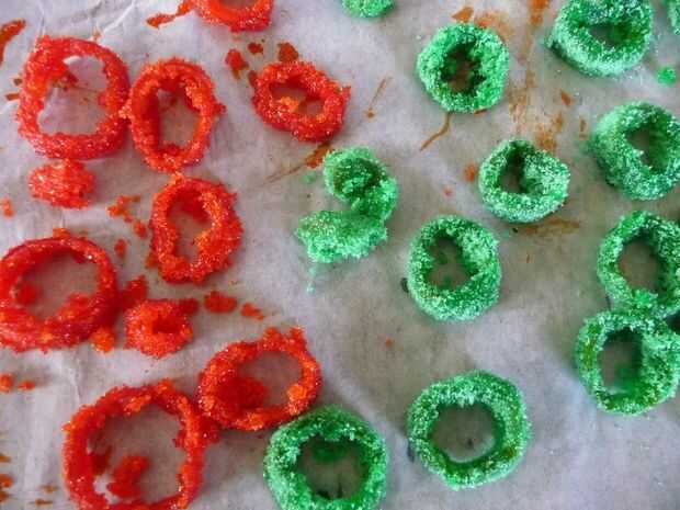 Hervor lento durante 1 minuto. Retire la sartén del calor y del 1 por 1, coloque los chiles en rodajas en el azúcar de colores coordinado. Sacudida para untar y luego sacar cada rebanada recubiertos de azúcar en el pergamino forrado para hornear.