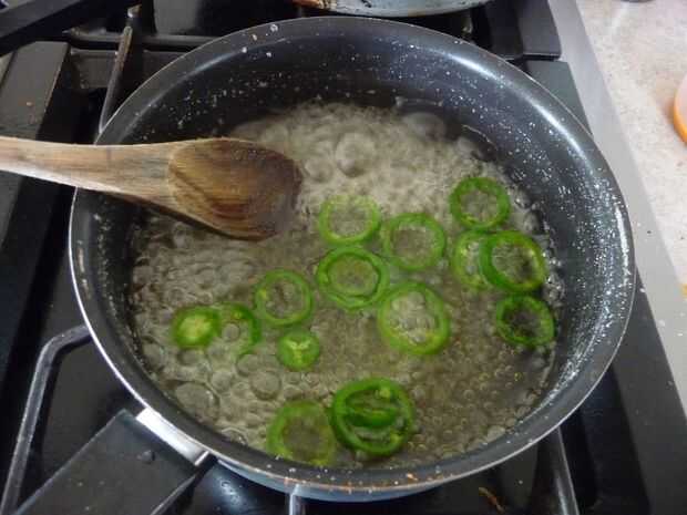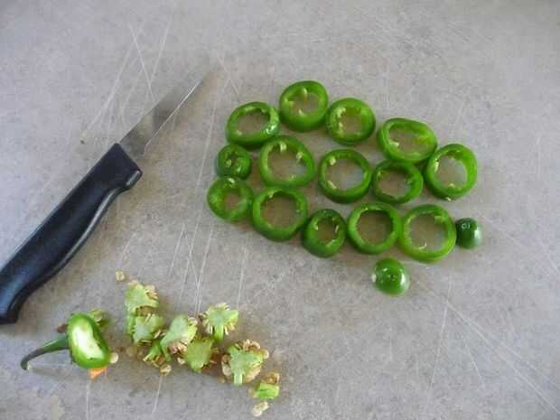 Cortar los jalapeños en rondas de 1/4". Utilice un cuchillo pequeño de cocina para cortar el exceso de fibra dentro de. Quitar las semillas, también. Ponga a un lado.