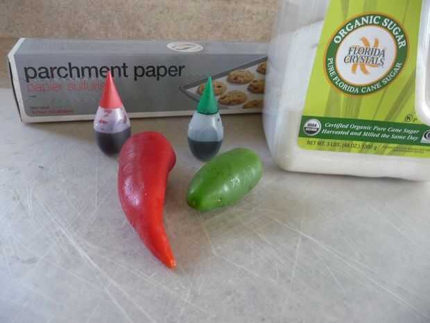 Colorante verde para jalapeños y colorante rojo para pimientos rojos.