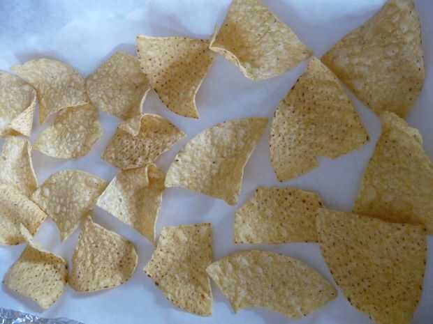 Seleccionar los chips de tortilla más plana del reborde de la bolsa y los ponen en la hoja de galleta alineada.