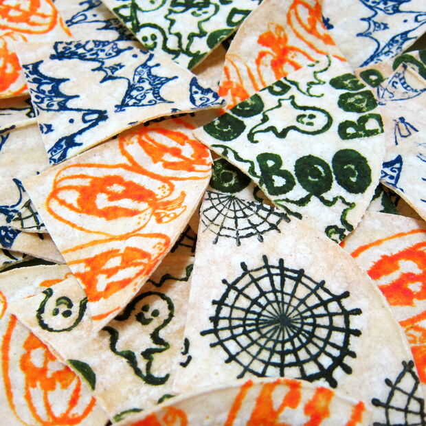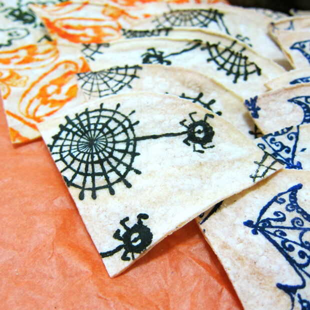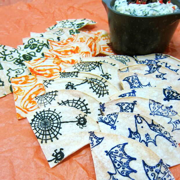 Si eres algo como yo y no desean que sus invitados Halloween se recaudó totalmente hacia fuera por todo lo que sirve (o si usted está sirviendo a los niños) podría hacer estos chips de tortilla estampado casero simple. Son seguros comer y acompañará a un evento de comida sangrienta muy bien si ese es tu tema.