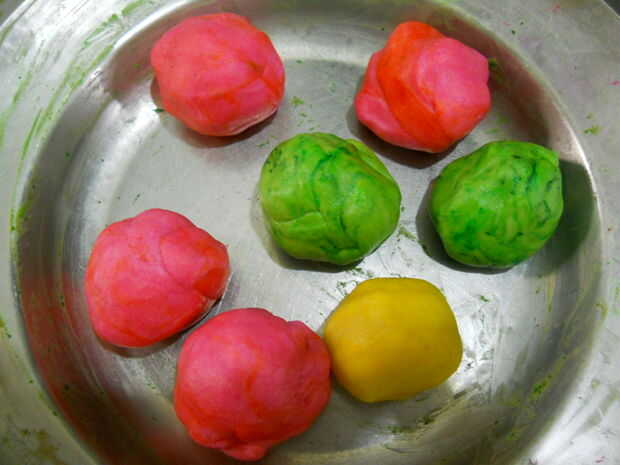 hacer 7 pequeñas partes iguales de esa masa. en 4 partes añadir color rosa en 2 partes añadir color verde y en 1 pieza restante Agregue colorante alimentario amarillo.